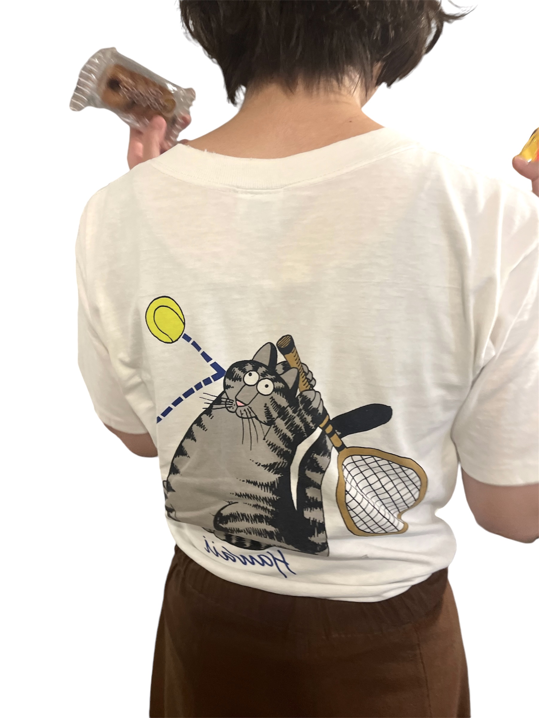 BLOG ナイスキャット。 2024-09-02 / あれ? わたなべさん めちゃんこ可愛いTシャツ着てるじゃんか。 って わたしが買ったやつだよ!!!!!! このTシャツ見つけた時 「これは買うしかない」 「買わない運命は無い」 って 通販 GO! したんだけども 壊滅的に似合わなくって 鏡の前で悪戦苦闘した末 わたなべさんに差し上げた。 バックプリントも最高だ!ちくしょー! (バッチリ似合っている!) こいつクリバンキャット。 愛くるしい猫。 涙出る。 おやすみ…