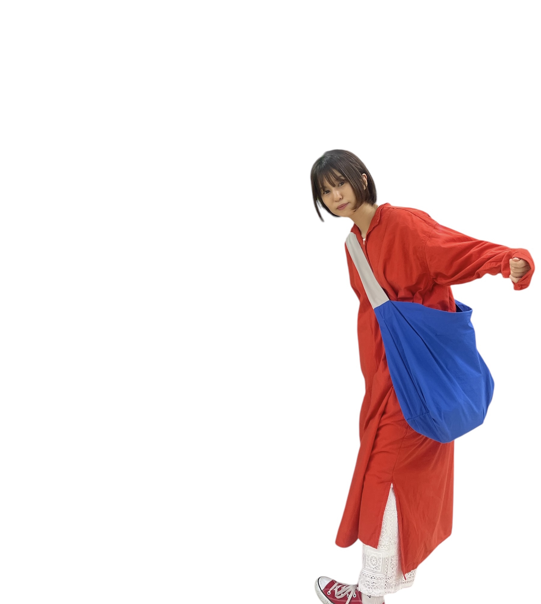 BLOG 青と赤って。 2025-05-09 / めっちゃ好きだなあ。青いバッグに赤い服。これも青と赤。この写真も昔から好きだった。 というわけで 京都&名古屋 贈呈ステッカー。赤寄りのピンクかな? とにかく好きな感じ。 雑な内田のイラストに わたなべさんが色味をつけてくれた。 お楽しみに。(コチラ惜しくも落選した豚)